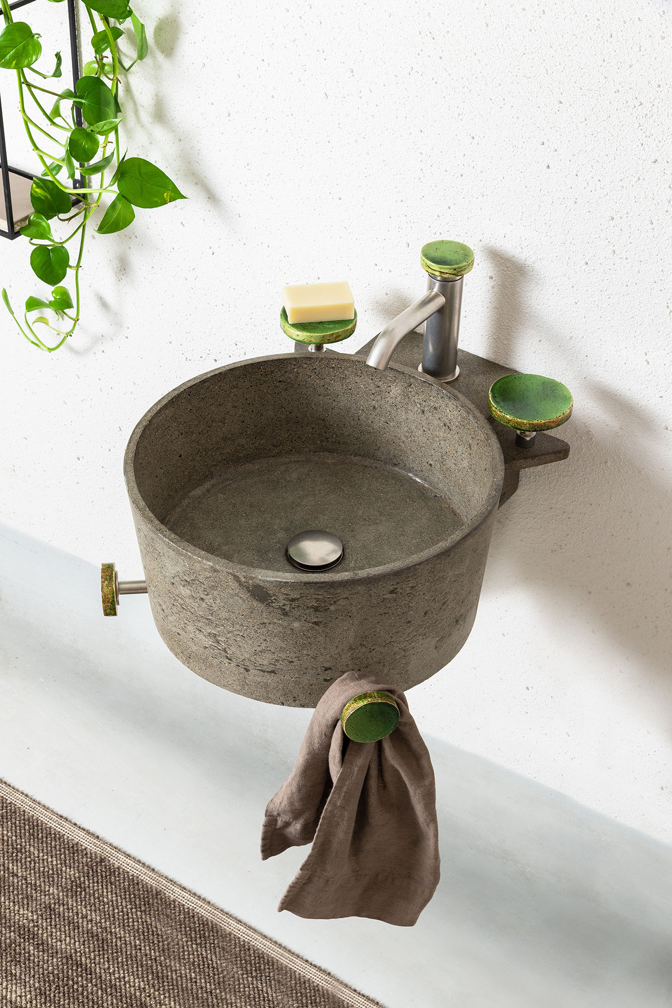 “Frog” Lavabo da parete in cemento con porta saponi e porta asciugamani